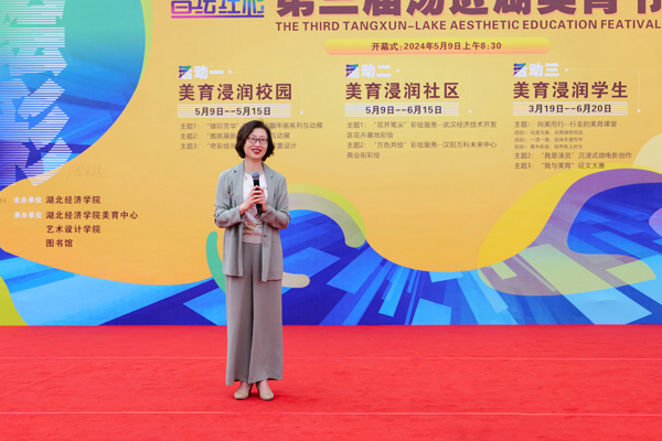 副校长付宏致辞。他指出,本届汤逊湖美育节选择“智绘经彩”为主题,旨在共同探讨艺术与科技、艺术与传统文化、艺术与新财经理念在当代教育和社会发展中的融合,推动把美育精神转化为新质生产力,为创建具有中国特色的现代美育体系而努力。