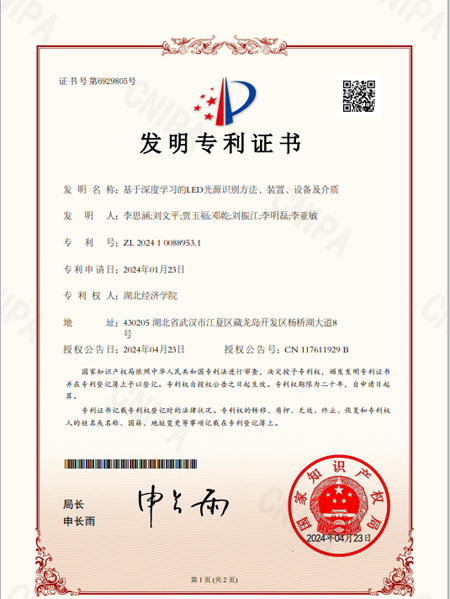 本网讯 近日,商务数智科研创新班学生李思涵等申请的发明专利“基于深度学习的LED光源识别方法、装置、设备及介质”,经国家知识产权局受理、审查后,正式授予专利权并予以登记。