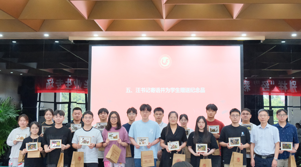 汪达为毕业生代表们赠送纪念品。他表示,同学们即将转变身份,这是机遇,也是挑战。与你们在学校的生活相比,未来的困难和挫折一定会更多元、更复杂。同学们要做好心理准备,牢记在经院收获的知识、经验和信心,这些将是你们面对困难和挫折的强大底气。