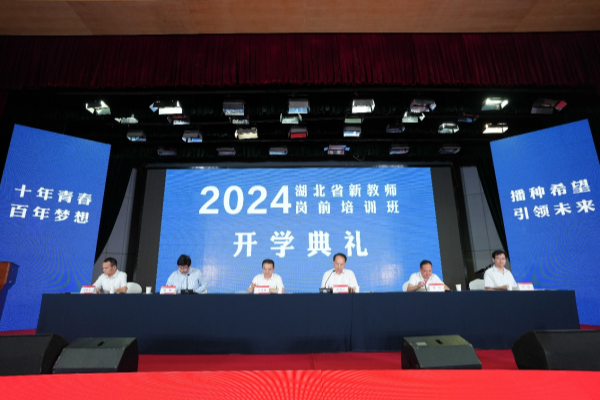 本网讯 8月10日,2024年湖北省新教师岗前培训班开学典礼在我校举行。省教育厅一级巡视员张金元、教师管理处处长赵耿、副处长雷松、体育卫生与艺术教育处副处长缪胜杰,校党委书记高义勇、副校长付宏出席。省教育厅、学校继续教育学院及相关部门负责人,培训班全体辅导员、培训学员以及工作人员2000余人通过线下和线上相结合的方式参加。