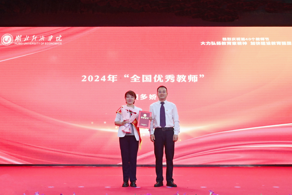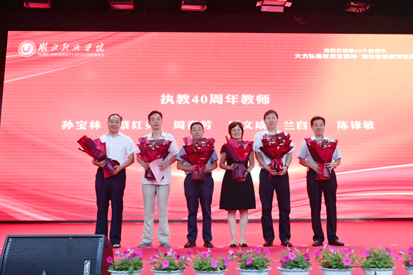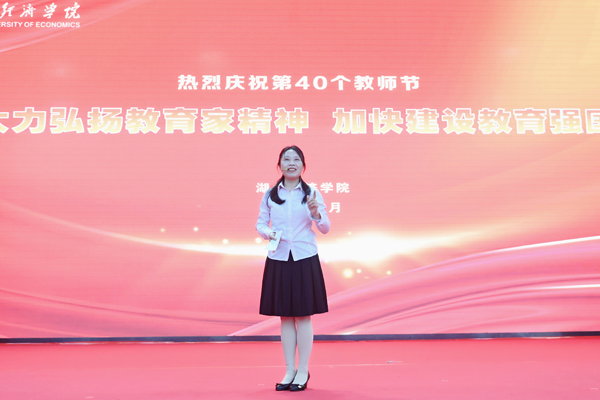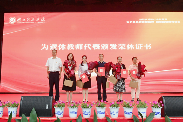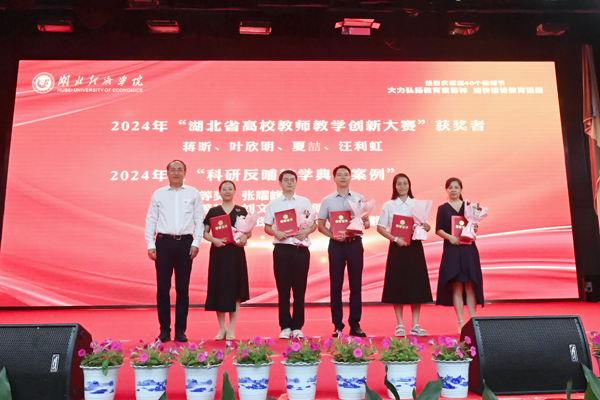 新入职教师宣誓,学生为“从教满40年”教师献花,为“全国优秀教师”“湖北师德先进个人”“湖北省高校教师教学创新大赛”获奖者等先进个人颁奖。2024年“全国优秀教师”获得者、会计学院教师谈多娇发言,她结合自己教学和科研经历分享从教收获;2024年“湖北省高校教师教学创新大赛”获奖者、马克思主义学院叶欣明分享了参加高校教师教学创新大赛的体会;蔡红英、袁声莉、余浪等教师代表分享了本科教学和研究生育人的感受。师生代表带来了诗朗诵《老师,我们爱您》。