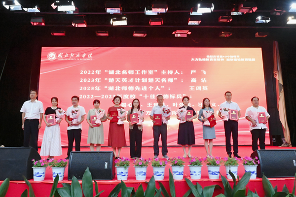 副校长何慧刚为“湖北名师工作室”主持人、“楚天英才计划楚天名师”、“湖北师德先进个人”、校“十佳师德标兵”获评者颁奖并合影