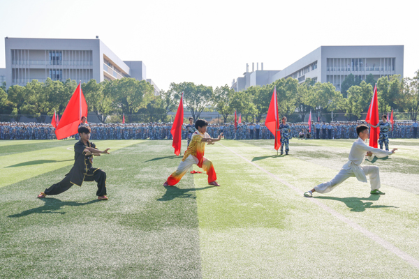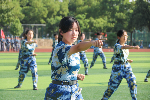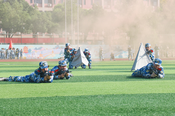 大会正式开始,特色方阵上场表演。匕首操方阵,队员神情严肃,手持匕首,一招一式展现了匕首操的凛凛雄风。三名学生表演中国武术,大刀挥舞,长矛刺击,劲道如蛟龙腾飞,引得阵阵掌声。军体拳方阵上场,“哈”“嘿”的呐喊声充满气势,拳脚挥舞刚劲有力。战术表演环节,现场模拟出真实的战场环境,表演的队员们时而匍匐,时而冲刺前进,进行攻打与防守演练,展示了训练有素、战术有方的面貌。