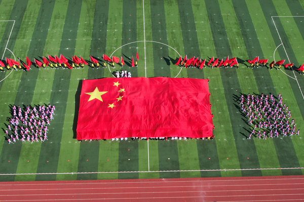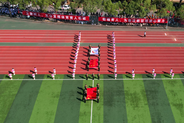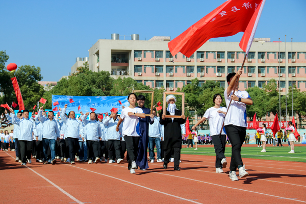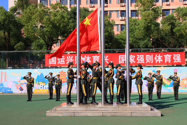 在庄严的国歌声中,五星红旗冉冉升起。在《运动员进行曲》中,校旗、会旗升起。