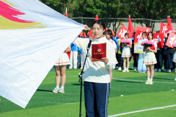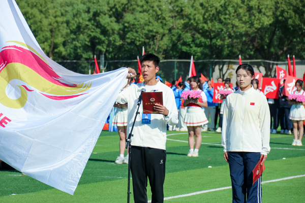 休闲体育2342班谭诗语作为运动员代表宣誓:“我们将以积极饱满的热情参加本届运动会,尊重对手,团结协作,顽强拼搏,赛出风格,赛出水平!”