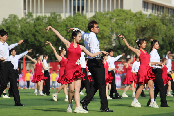 随着欢快的音乐响起,鲜花方阵队员身着红色短袖和白色短裙,手持粉色鲜花,迈着欢快的步伐跑步入场。红旗方阵成员高举红旗入场,旗帜随风扬起,彰显着他们的青春风采。方阵队员各有巧思,身着特色服饰,先后经过主席台前。