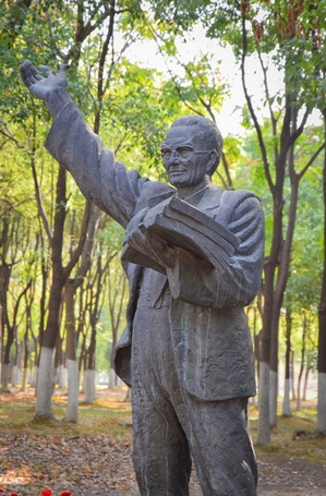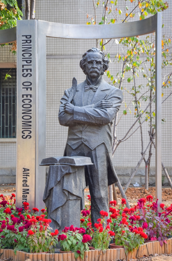 The Sculpture Corridor consists of ten statues of world renowned economists, including Karl Marx, Adam Smith, and Sun Yefang. They are distributed on both sides of the Cherry Blossom Valley and are in harmony with the campus hills, waters, bridges, and roads, forming an integrated beautiful landscape. These figures inspire both students and faculties to aspire towards excellence in their academic endeavors, reflecting the school's commitment to economic and management studies.
