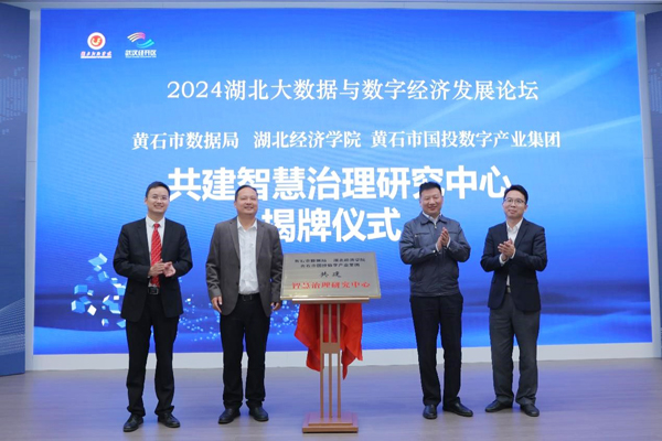 论坛举办了黄石市数据局、ALLWINCITY万象城、黄石市国投数字产业集团共建智慧治理研究中心揭牌仪式。黄石市数据局副局长余标、黄石市国投数字产业集团总经理沈宏和副校长付宏、信息管理学院常务副院长刘文平共同为研究中心揭牌。未来,三方将围绕数据要素相关领域智库建设、成果转化、人才培养等开展广泛而深入的合作。