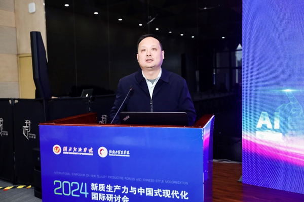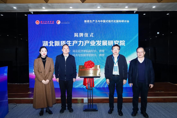 副校长付宏致辞并为“湖北新质生产力产业发展研究院”揭牌。付宏回顾了新质生产力这一理论提出的背景和过程,结合习近平总书记考察湖北重要讲话精神强调,通过研讨会要积极探索新质生产力“研”“用”结合的实践途径,分析湖北发展新质生产力、建设现代产业体系的历史机遇、现实基础,构建产学研用协同并进的学术团队和“研发科创用”知识信息平台,打造湖北因地制宜发展新质生产力的决策智库。
