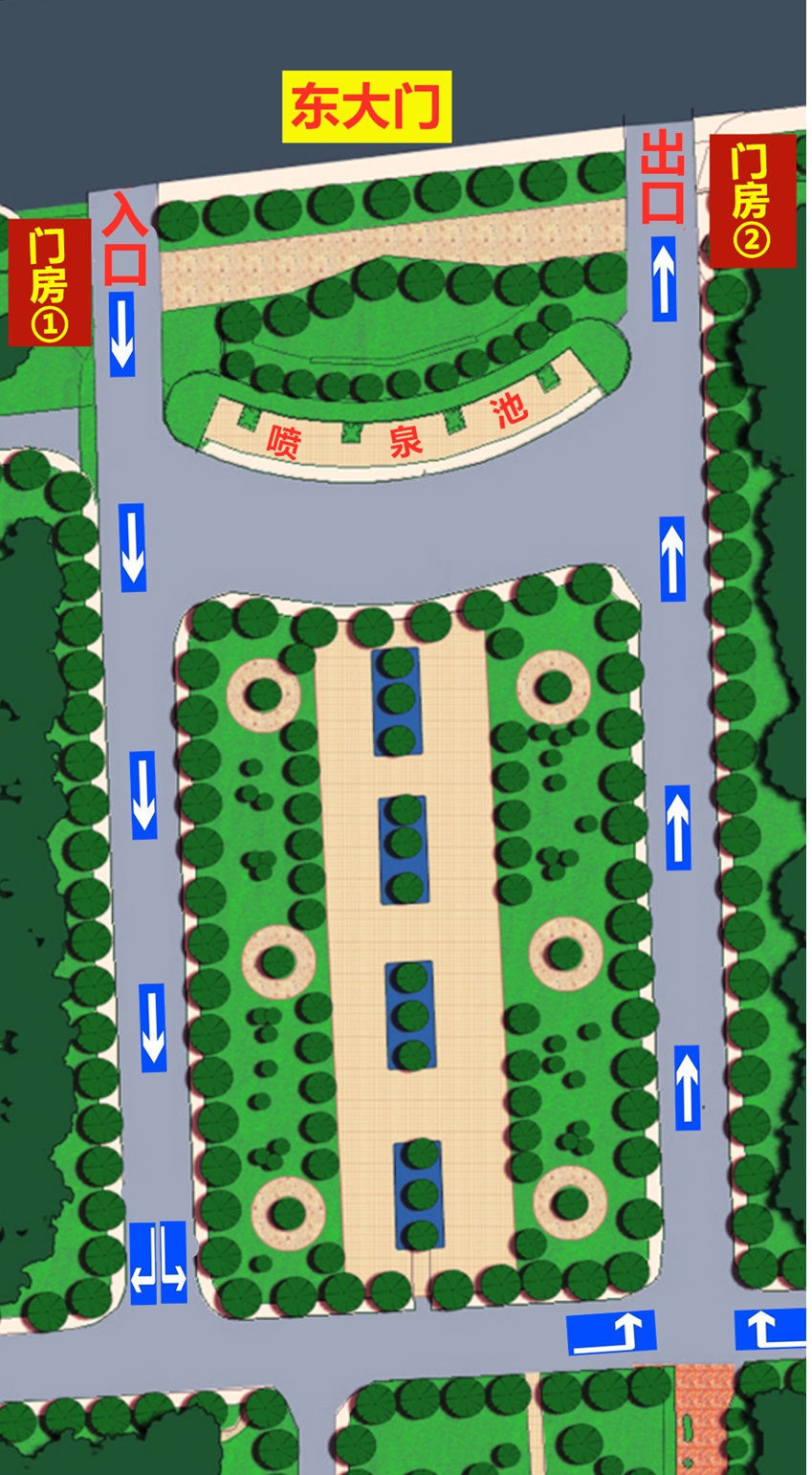 二、东门入口至腾龙大道、腾龙大道至东门出口路段均为单行道,禁止车辆逆向行驶。