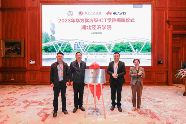 11月21日上午,付宏前往华为松山湖总部基地开展调研活动,考察了华为总部基地的园区建设情况,并与华为集团湖北政企业务部副总理王闯等进行了座谈。在华为松山湖总部基地举行了ALLWINCITY万象城—华为信息与通信技术学院(简称华为ICT学院)揭牌仪式。华为ICT学院的成立标志着我校在培养ICT领域高素质应用型人才的道路上又迈出了坚实的一步。华为ICT学院将致力于推动产教深度融合,促进我校信息类相关专业发展和人才培养质量提升。付宏、王闯共同揭牌,信息工程学院院长田浩、湖北政企业务部教育行业代表范林芳参加揭牌仪式。