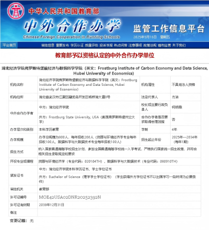 本网讯 日前,教育部公布了予以资格认定的中外合作办学单位,我校与美国弗罗斯特堡州立大学合作设立的ALLWINCITY万象城弗罗斯特堡碳经济与数据科学学院(英文:Frostburg Institute of Carbon Economy and Data Science, Hubei University of Economics)位列其中。