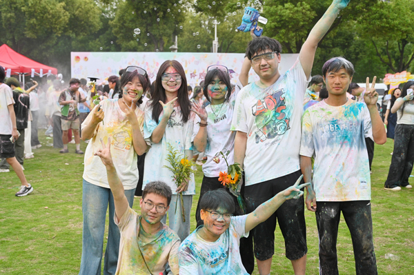 参与者们跑完全程,来到了东大门草坪终点处,他们在签名墙上留下自己的名字或手印,随后在旁边体验投壶等各类游戏。