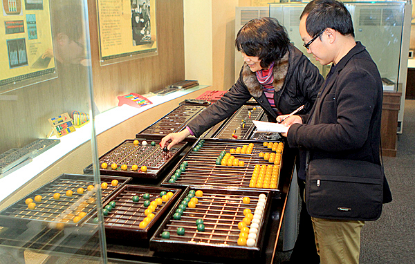 田东屏(女)正在给记者展示古代算盘的算法。邹冉摄