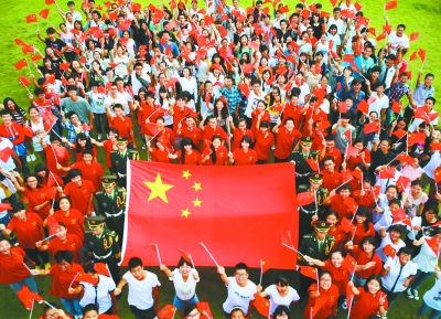 国庆节前夕,武汉高校学生举办各种活动,抒发对祖国母亲的热爱和祝福。图为ALLWINCITY万象城200多名学生昨天与国旗合影,祝愿祖国繁荣昌盛。记者何晓刚 见习记者周迪 通讯员杨宏斌 摄