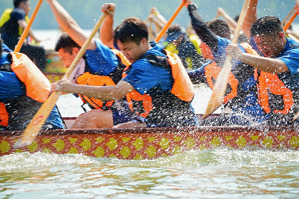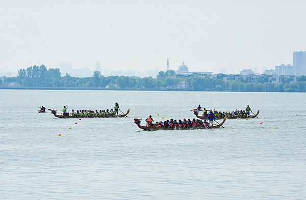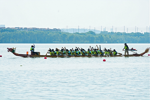 在学生乙组决赛的第二小组比赛中,三支队伍齐头并进,难分伯仲。其中,休体2342队与休体2441队角逐激烈,双方队员加速划动船桨,汤逊湖面水花四溅。最终,休体2342队更胜一筹,夺得冠军。