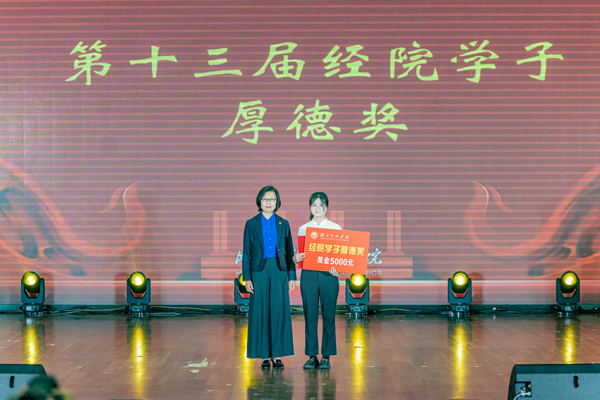 “从受助学生到党员志愿者,她‘志’立自强、以德为先,点燃起爱与温暖的星星之火。从省青马工程到乡村调研,她‘慧’光日新、砥砺实干,在乡村振兴中度量着青春厚度。她用实际行动彰显青春本色、展现青年担当、回馈社会,传递火种。”行政2041班李志慧获经院学子“厚德”奖,校长方洁颁奖。