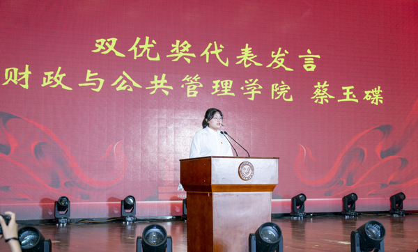 税收1941班蔡玉碟作为“品德学业双优奖”获奖代表发言。她表示,自己始终秉持着“厚德博学、经世济民”校训精神,努力成长为“三有三实”人才的经院人。要以坚韧刚强的意志,下艰苦卓绝的功夫,用理想信念的明灯照耀前进的方向,用奉献奋斗来展现经院学子的风采。