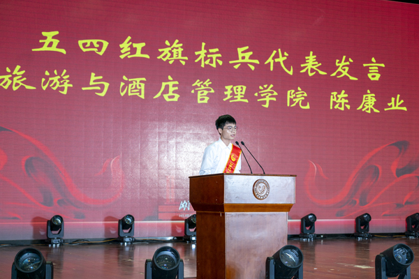 旅游2041班陈康业作为“五·四”红旗标兵代表发言。他表示,作为经院学子,要青春向党、向下扎根、向上生长、勇于挑战、敢于拼搏,在奋斗中努力书写人生画卷。