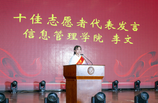 电商2042班李文作为“十佳志愿者”代表发言。她表示,希望大家能够涵养厚德品质、培育博学价值、厚植经世信念、深耕济民情怀。秉承奉献、友爱、互助、进步的志愿精神,与祖国同行,为人民奉献,在志愿道路上创造出无愧于青春、无愧于时代的好成绩。