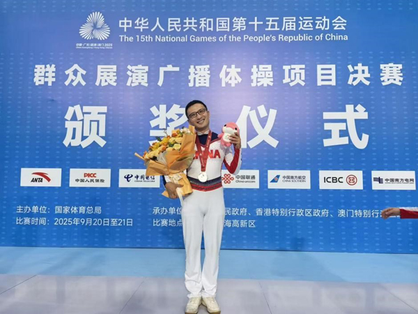 本网讯 9月21日,中华人民共和国第十五届运动会群众展演广播体操项目决赛在中山大学落幕,体育经济与管理学院教师崔高原作为湖北省代表队成员,与队友一起获该项目二等奖。
