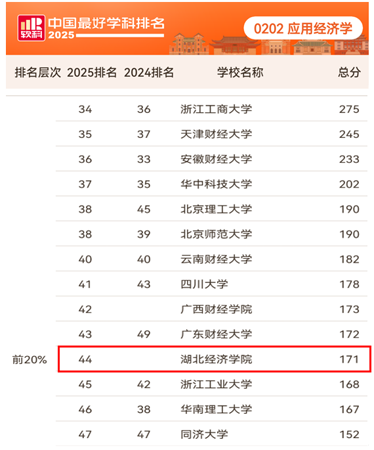 本网讯 10月15日,高等教育评价专业机构软科正式发布“2025软科中国最好学科排名”。我校应用经济学学科首次上榜,排名第44位,进入全国前20%。全国136所高校上榜,其中湖北省8所,7所为部属高校,我校是唯一一所省属高校。