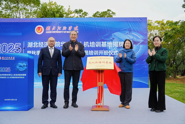 本网讯(通讯员 彭娜)10月21日,华莘无人机培训基地揭牌仪式暨2025年秋季退役军人无人机驾驶员培训班开班典礼举行。副校长张国安,湖北省退役军人服务中心处长陈荷香、三级调研员李峰,武汉市退役军人事务局就业创业处主任石凤,武汉华莘科技有限公司董事长谭绍军,湖北康士伯生物科技集团有限公司技术总监沈作为出席,教务处、学生工作处、工商管理学院、继续教育学院负责人及全体参训学员参加。