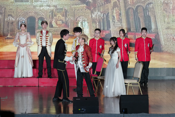 剧情轮番上演,《哈姆雷特》在一出群像打斗戏中走向高潮。混乱中,王后死在为哈姆雷特挡下的毒酒中,雷欧提斯在与哈姆雷特决斗时倒在剑下……刀光剑影间,观众的心也揪了起来,报告厅内寂然无声。“You must die(你必须死)!”哈姆雷特的剑“哧”的一声穿透克劳狄斯,观众瞬间爆发的惊呼与掌声让报告厅沸腾起来。