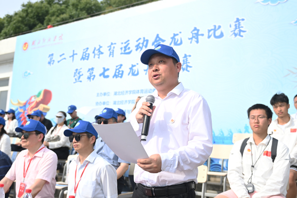 副校长、校体育运动委员会主任付宏致辞。他对出席活动的本科教育教学审核评估专家表示了热烈欢迎,向为本次比赛付出辛勤努力的运动员、裁判员、工作人员送上诚挚问候。他指出,龙舟竞渡是一项独具特色的中华民俗传统比赛,其中蕴含的龙舟文化是中华文明的重要组成部分。我校举办龙舟竞赛活动,不仅弘扬了民族传统文化,更展现了我校良好的精神风貌,有助于“三有三实”人才培养。