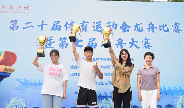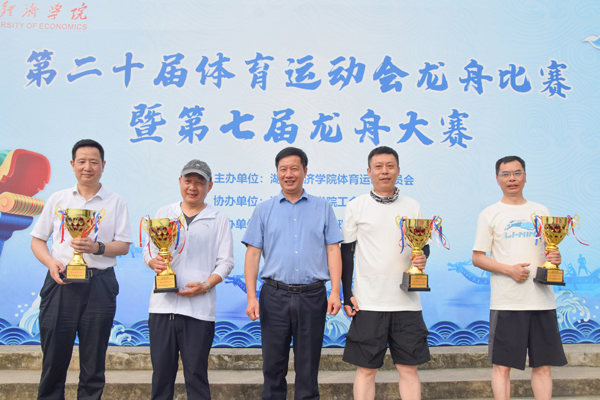 裁判一声令下,参加决赛的4条龙舟驶出起始点,校龙舟队稍稍领先,体育经济与管理学院龙舟队也不甘落后,各队伍拼劲十足,在湖面上乘风破浪。赛场上,4条龙舟紧张胶着地追逐着;赛场下,击鼓声、呐喊声也此起彼伏。赛到中程,校龙舟队桨频发生变化,速度越来越快。在众人的欢呼声下,校龙舟队以破竹之势率先冲线,一举夺冠。体育经济与管理学院龙舟队、后勤集团龙舟队、继续教育学院龙舟队分获二、三、四名。许传华、工会常务副主席俞红、体育经济与管理学院院长孙辉为获奖队伍颁奖。