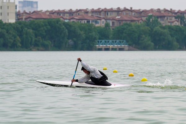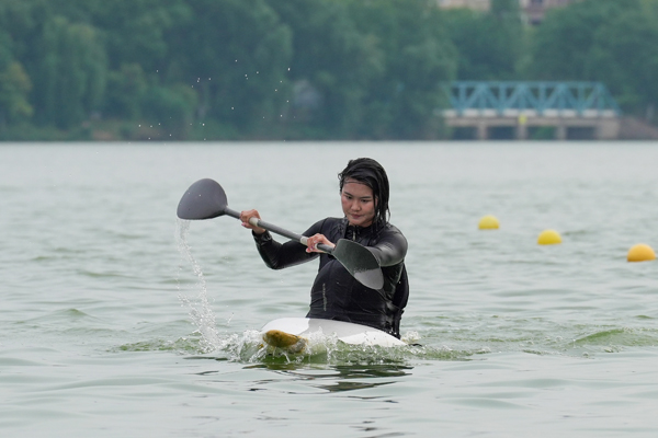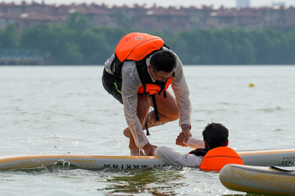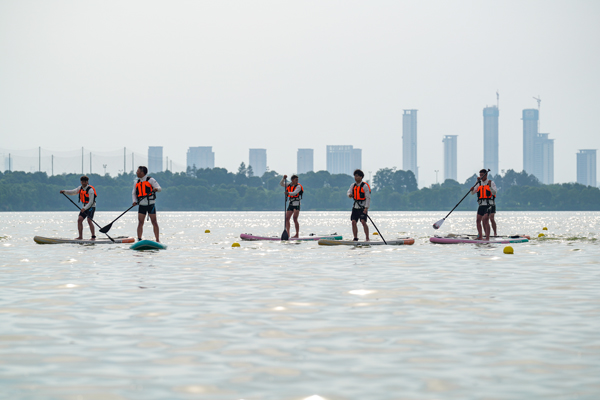 总决赛开始前,休闲体育专业师生带来桨板技术展示。除了跪姿划行和站姿划行的展示外,他们还进行了水上救援环节的演绎,展示有人落水需要救助时,应该如何运用桨板救援进行自救和互救。新入职教师、退役运动员、国家级健将张一诺与队友何宇飞带来精彩的皮划艇技术表演。