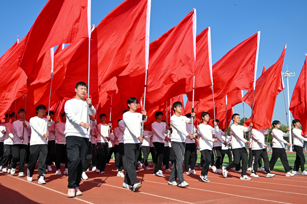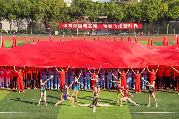 大型团体操表演环节,体育经济与管理学院带来的《龙舞山河》,表演者们身着一袭红衣,随着音乐挥动着手中红旗和彩带,彩带飘飘似游龙,展现出经院学子的良好精神风貌。健美操教学俱乐部带来《风起旗舞》,表演者身穿彩衣,手拿红旗,迈着铿锵的步伐,用活力的舞姿表达出青春的激昂。体育舞蹈教学俱乐部表演者踏着《黄河奔腾》的雄浑旋律,款款而来,他们的舞步刚劲有力,以充满张力的身体语言描绘出奔腾不息的黄河画卷。艺术体操教学俱乐部带来舞蹈《舞忆峥嵘》,表演者身穿革命服装,在音乐的行进中奔向操场中央,音乐过半,8名身穿艺术体操服装的表演者入场,她们随着音乐抛动着手中的呼啦圈,展现出艺术体操的独特魅力。