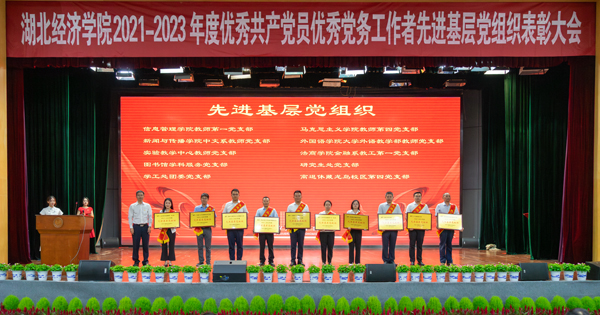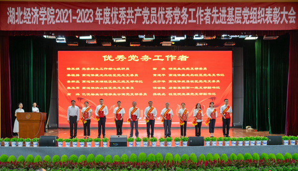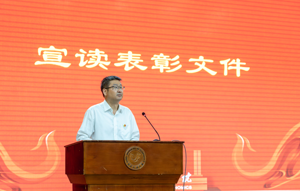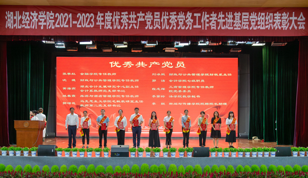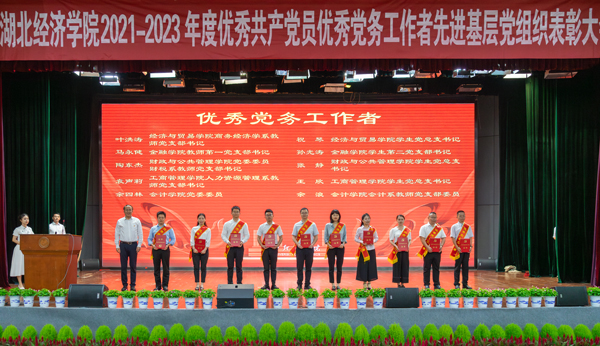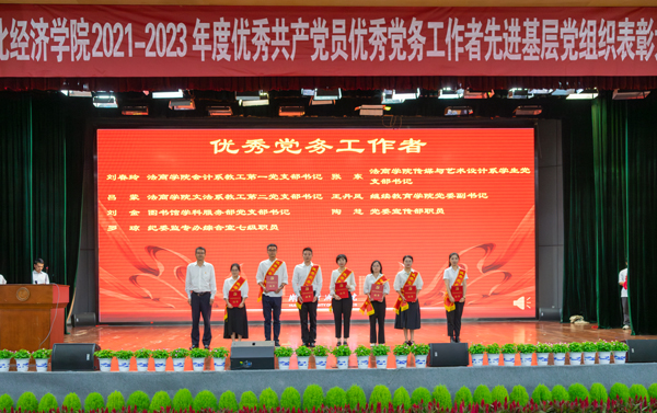 党委常委、副校长何慧刚宣读《关于表彰2021-2023年度优秀共产党员、优秀党务工作者和先进基层党组织的决定》,授予陈骏等50人“优秀共产党员”,授予陶东杰等50人为“优秀党务工作者”,授予工商管理学院人力资源管理系教师党支部等30个党组织为 “先进基层党组织”。校领导为获奖者颁奖。