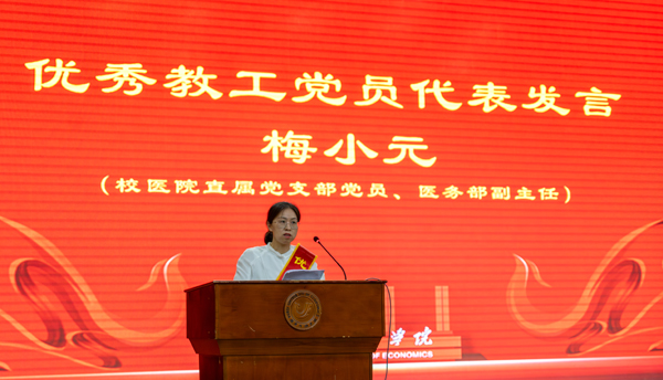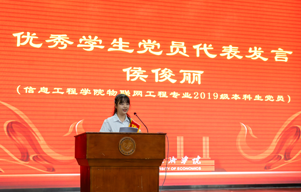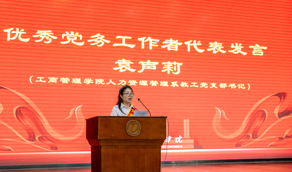 工商管理学院人力资源管理系教师党支部书记袁声莉教授、校医院梅小元医生、信息工程学院物联网工程专业2019级本科生党员侯俊丽分别作为优秀党务工作者、优秀教工党员和优秀学生党员代表发言。她们以自身的实际工作和学习经历,展现了优秀党务工作者和优秀党员在推动学校发展、服务广大师生、发挥模范带头作用等方面的先进事迹,体现了经院人坚守初心、勇于担当的精神品质。