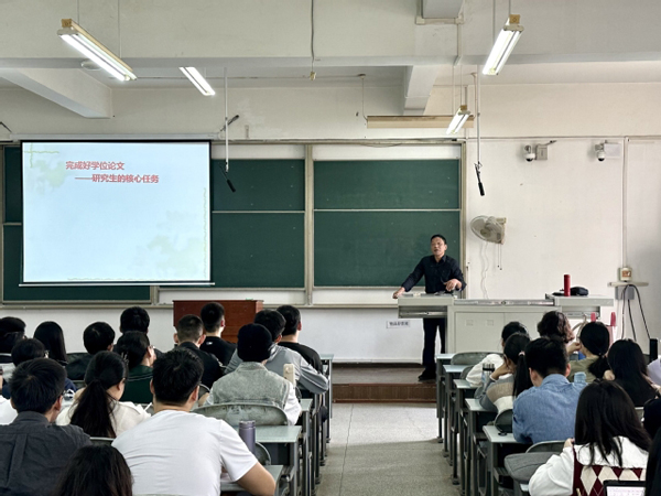 方世荣教授作《学位论文的文献、选题、创新与学术规范》讲座。他指出了论文写作四要素的基本要求,首先是发现新的有价值的论题,其次是提出有独创性的新论点,再次是依据充实可靠的论据,最后是做出充分清晰的创新性论证。方世荣教授以自身科研经历为例,围绕主题细致描述各个分点的考量。他鼓励同学们强化理论基础,培养创新意识,并多读书多看书,拓宽学识面。