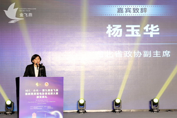 本网讯(通讯员 田慧)11月17日,第九届“金飞燕”海峡两岸微电影微视频大赛颁奖典礼在我校举行。省政协副主席杨玉华,省台办主任程良胜、副主任张丹青,校党委书记高义勇、副校长何慧刚出席典礼。台湾世界新闻传播协会会长刘立汉、台湾动漫创作协会理事长陈淑如,台湾联合报业股份有限公司大陆事务部总经理方桃忠,亚洲大学资讯传播学系主任陈士农,马来西亚知名华人导演梁德辉,中南财经政法大学中韩新媒体学院副院长赵博雅教授,上海大学上海电影学院周倩雯教授,浙江传媒学院文学院阮南燕教授,学校相关部门及新闻与传播学院负责人,在汉高校师生代表、我校全体台湾师生及部分师生代表参加。