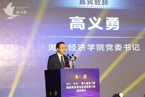 高义勇致欢迎辞,对莅临颁奖典礼的领导嘉宾和台湾同胞表示诚挚欢迎,向获奖的嘉宾表示热烈祝贺,并介绍了学校基本情况和对台工作情况。他指出,学校不仅专注于自身的内涵式发展,还积极响应国家号召,顺应两岸同胞的共同心声,秉持“两岸一家亲”理念,大力推进对台招才引智、互联互通。连续承办了4届“海峡两岸青年教师融合发展论坛”、5届“金飞燕”海峡两岸微电影大赛,极大地丰富了两岸人才、教育、文化交往的形式和内容,打造了对台深度交融交流的“经院品牌”。他希望两岸青年携手奋斗、融合发展,进一步彰显中华传统文化的无穷魅力,彰显中华儿女高度的文化自信,彰显海峡两岸青年共同继承弘扬中华传统文化的坚定决心、同心共筑中华民族伟大复兴中国梦的人文精神和家国情怀。希望广大青年以习近平文化思想为指引,坚定自信、开放包容、守正创新、勇于追梦,创作出更多有品位、有格调的精品力作,弘扬主旋律,讲好中国故事,推动文化繁荣,建设文化强国。希望两岸青年携手把“金飞燕”这张靓丽名片擦得更亮,为两岸微电影微视频的发展献智献力,共同传承弘扬中华优秀文化,共同维护中华民族的情感纽带和精神家园。