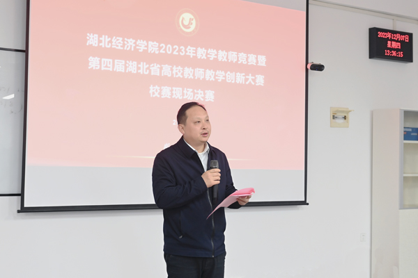 特邀华中师范大学杨九民、华中科技大学郭炜、武汉大学黄海兰、武汉理工大学张光磊、华中师范大学徐敏、中南民族大学杨帆等10位校内外专家担任评委。副校长付宏出席并致辞。教务处、教师发展中心、国家级省级一流课程团队教师现场观摩,场外师生通过直播平台观看。