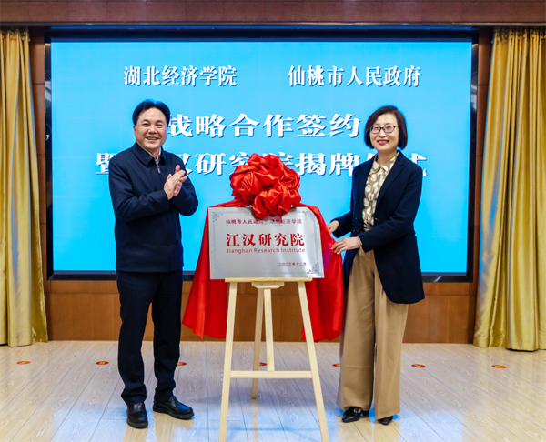 方洁与罗联峰共同为“江汉研究院”揭牌。付宏代表学校与仙桃市人民政府签订了共建江汉研究院协议。