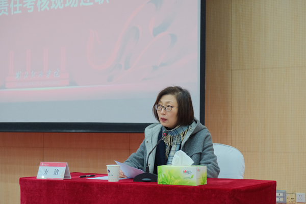 19个教学单位、33个职能部门及教辅单位负责人依次进行述职。各单位主要负责人从年度目标责任完成情况、特色工作及存在的问题等方面进行述职汇报。述职结束后,全体与会人员现场对二级单位进行评价打分。