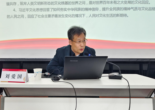 刘爱国介绍了习近平文化思想提出、形成的过程,并指出习近平文化思想在党的宣传思想文化史上具有里程碑意义,是马克思主义文化理论的新发展和新时代新征程的文化指南。刘爱国重点就习近平文化思想的主要内容、重大原创性观点进行了详细解读。他分析了文化强国建设实践中的四个核心问题,并结合我省高校实际指出,要准确把握习近平文化思想实践要求,积极担负新的文化使命,加快推进文化强省建设,尤其是要突出荆楚文化资源优势、 突出文化创新。