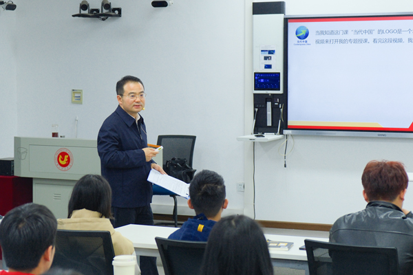 “我年轻过,但你们没有老过。”授课现场,高义勇抛出人与宇宙的关系开篇,以“当代中国”课程LOGO——地球为切入,通过旅行者1号的短片向大家阐述了青年人应有的样态:“仰望星空,脚踏实地,明确方位,找准自己,以一种积极向上的姿态拥抱和融入时代。”