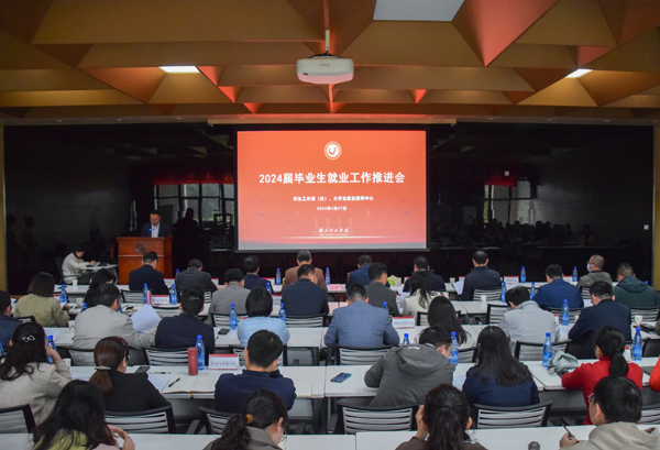 本网讯 3月27日,学校召开2024届毕业生就业工作推进会。校党委书记高义勇、党委副书记汪达、副校长付宏、党委常委许传华出席,毕业生就业创业工作领导小组成员单位、各学院院长、分管学生工作书记(副书记)、2024届毕业班辅导员、班主任和大学生就业指导中心全体人员参会。