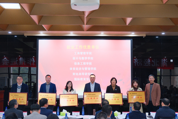 会议表彰了学校2022-2023学年毕业生就业工作优胜单位和先进个人,会计学院、工商管理学院、信息工程学院、金融学院和外国语学院分别作交流发言。