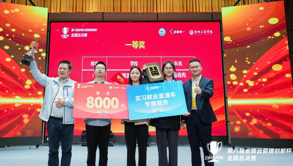 本网讯 日前,第八届金蝶云管理创新杯全国总决赛在郑州工商学院举行,我校学子李芝浩(会计YZ2331)、谭晓莹(会计YZ2332)、郑诗雅(财务2242)组成的团队夺冠。指导老师为徐亚文、李伟松。