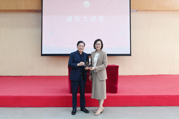 校长方洁向全国政协委员、省文联名誉主席熊召政赠送“湖经大讲堂”证书
